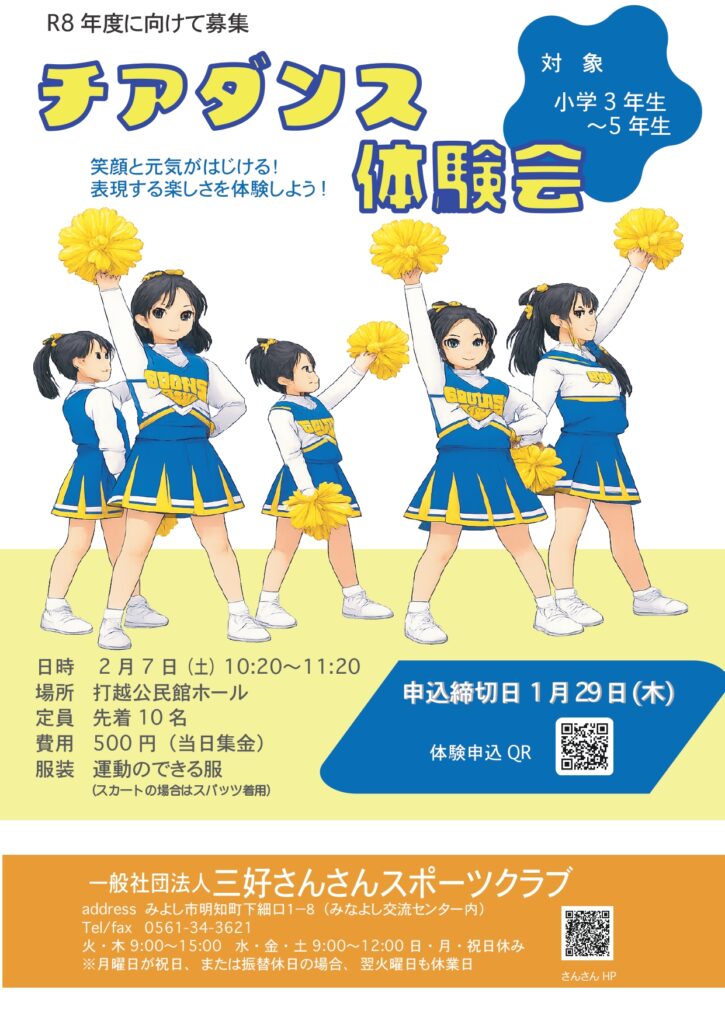 定員に達しましたので、受付を一時中止しています。 体験希望の方は、恐れ入りますが、受付時間内に事務局(0561-34-3621)まで電話、またはホームページ下のお問合せよりメールをお願いします。
